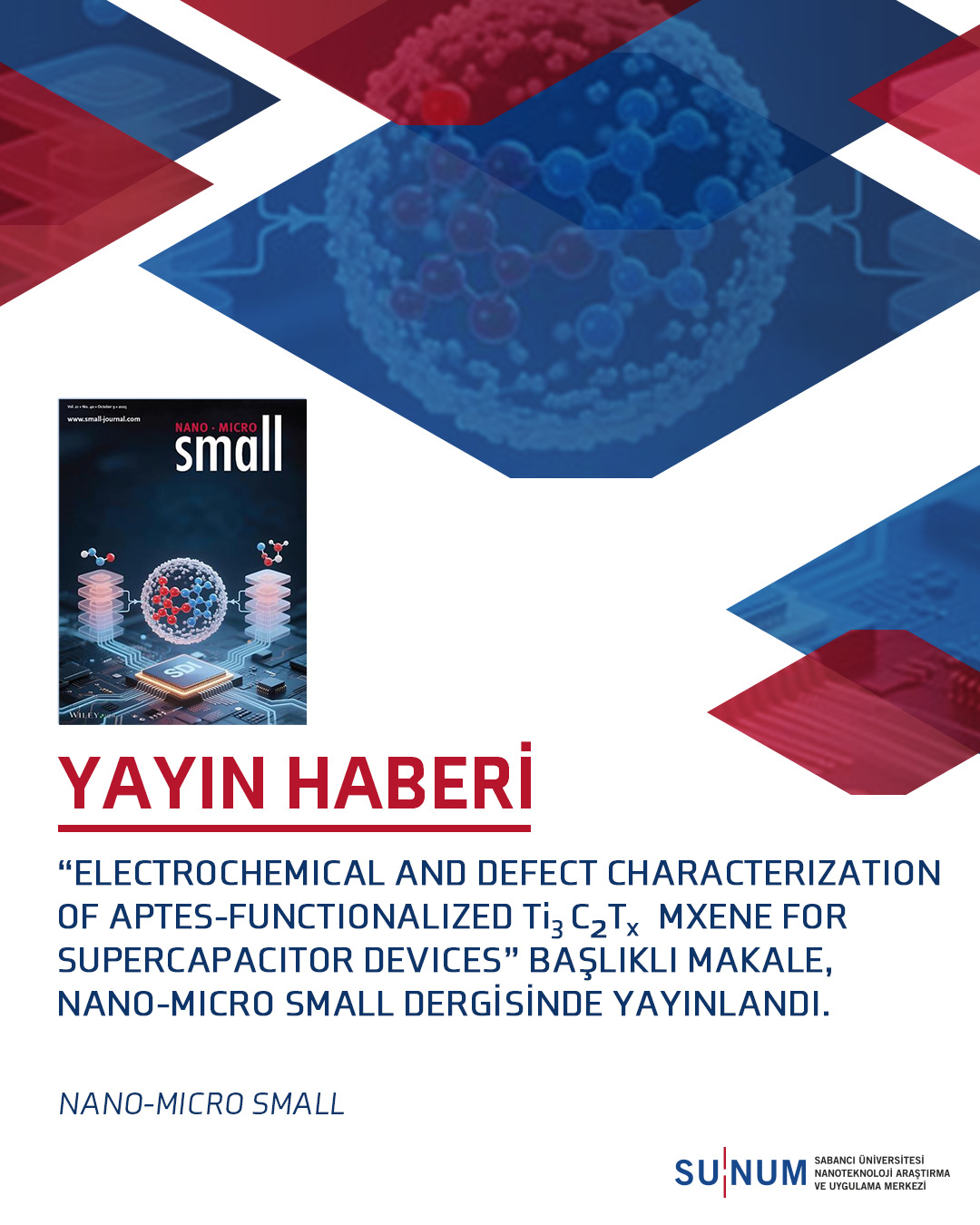The study titled “Electrochemical and Defect Characterization of APTES-Functionalized Ti3C2Tx MXene for Supercapacitor Devices” prepared by SUNUM researcher Mina Namvari, was published in NANO-MICRO Small by invitation.