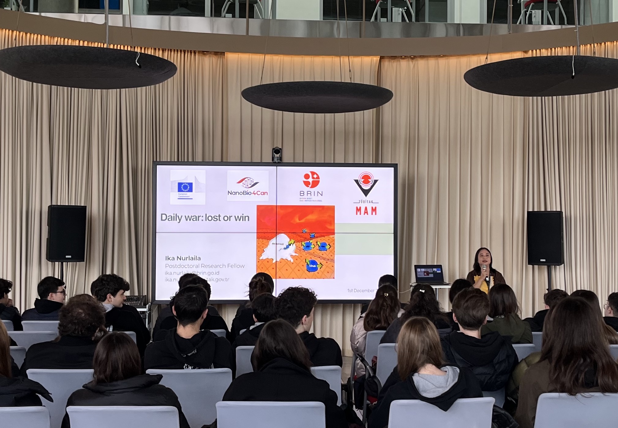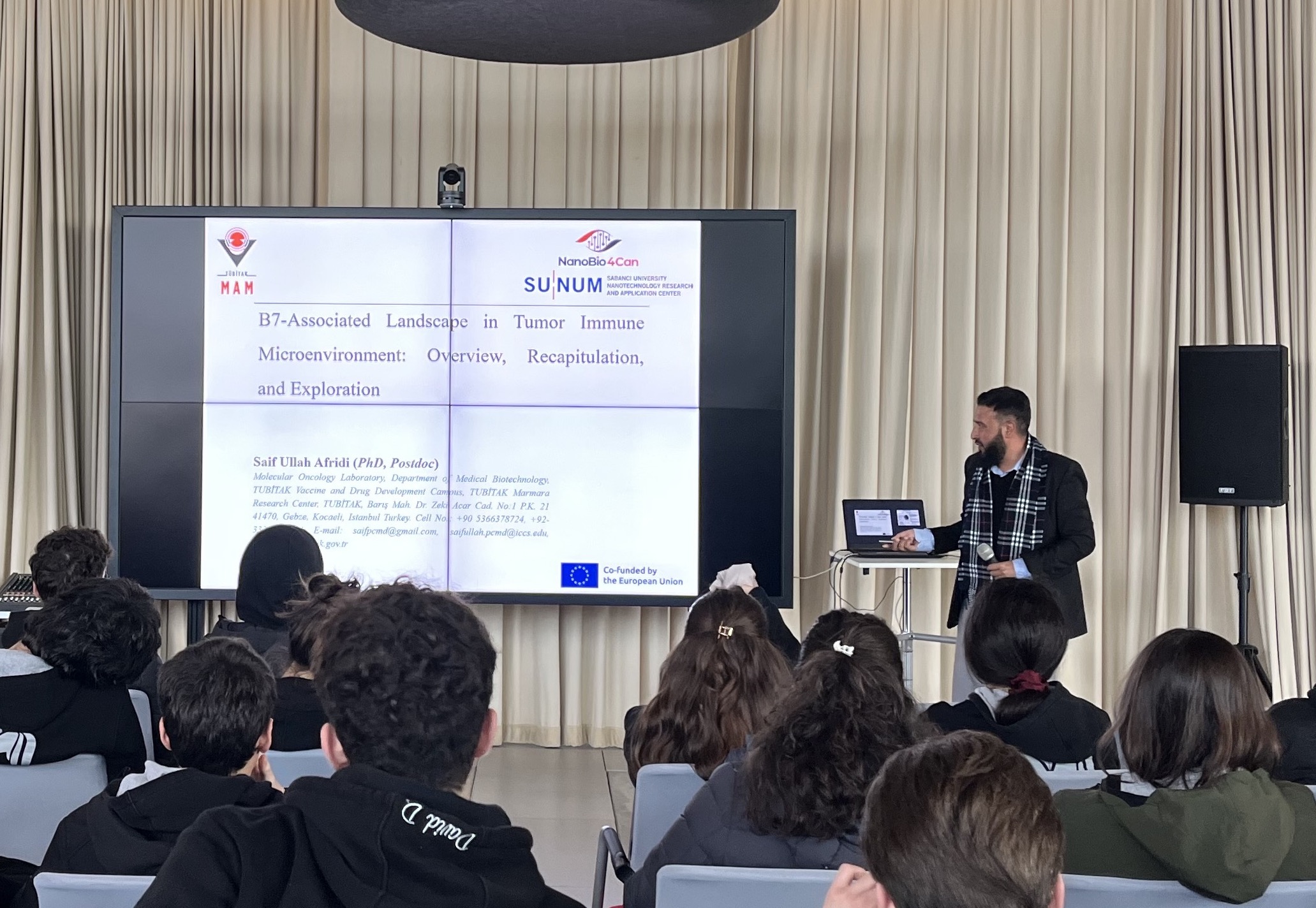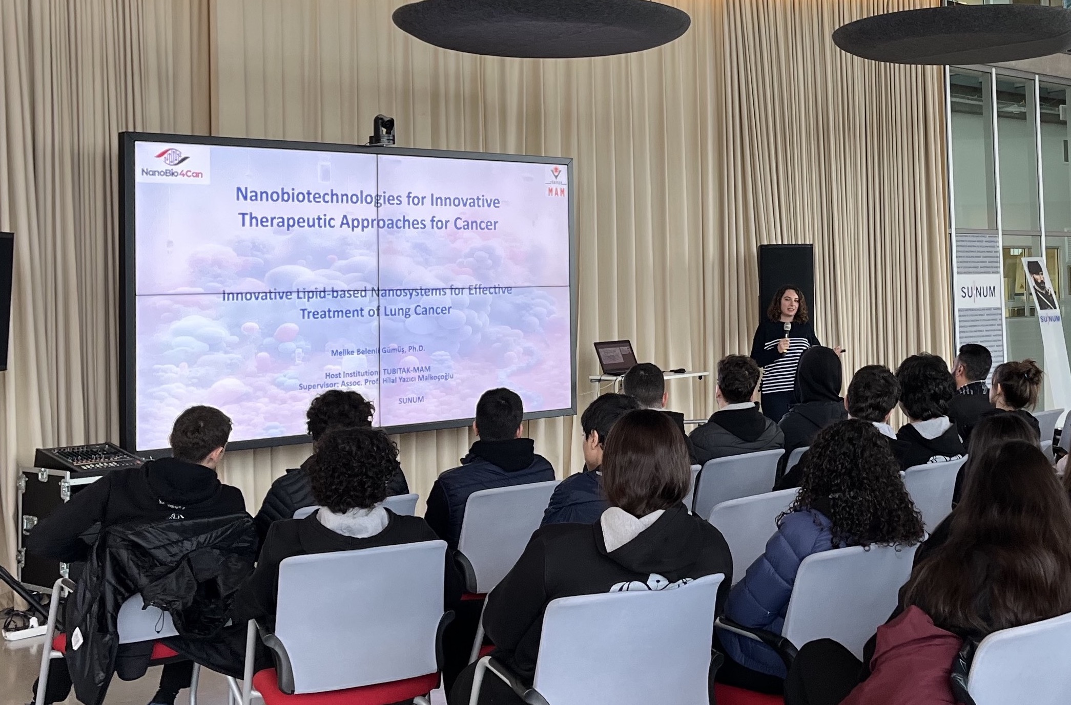 On November 18, 2025, we hosted students from İstanbul Private Saint-Michel French High School at SUNUM. We provided students and teachers with information about our competencies, research areas, and laboratories. As part of our efforts to raise awareness about the social impact of nanotechnology, we brought together NanoBio4Can MSCA Cofund fellows Dr. Ika Nurlaila, Dr. Melike Belenli Gümüş and Dr. Saif Ullah (Afridi) with the students. The researchers gave presentations about their work and answered questions from the students.