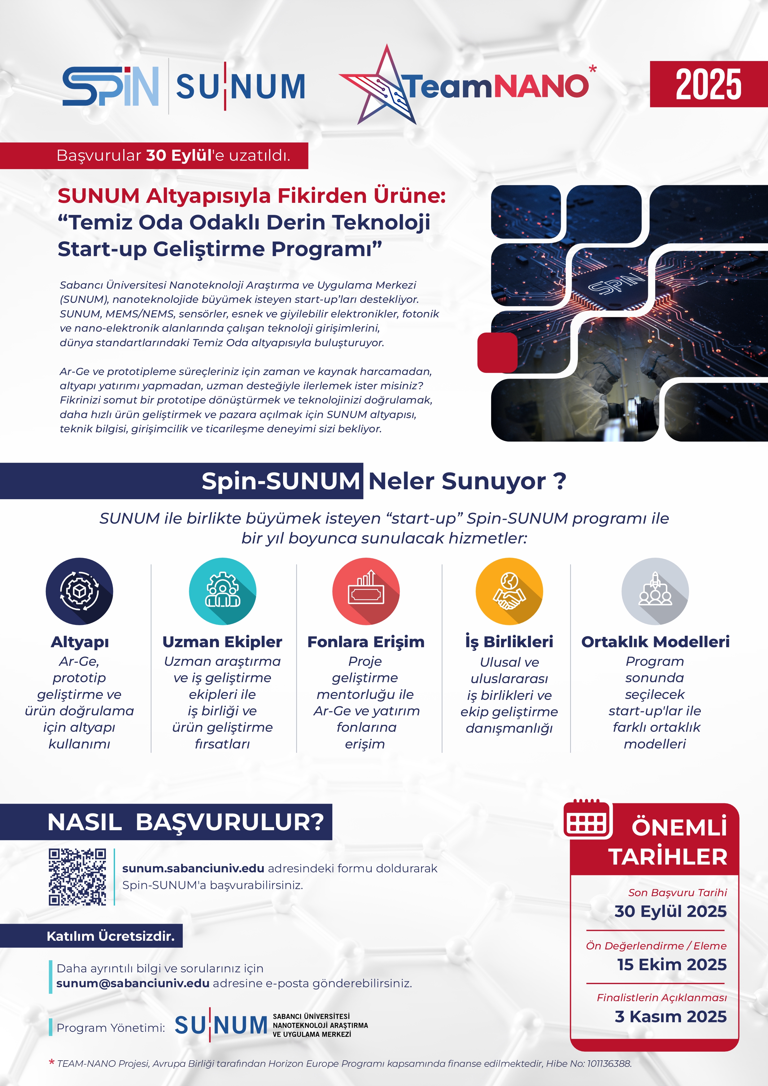 TEAM-NANO'nun sunduğu olanaklarla Spin-SUNUM katılımcıları, University of Southampton ve TUDelft gibi Avrupa'nın önde gelen merkezlerinden uluslararası uzmanlık desteği alırken, yeni ekipmanlar ve altyapı iyileştirmeleriyle sürekli modernize edilen bir araştırma ortamına erişim sağlayacak.
